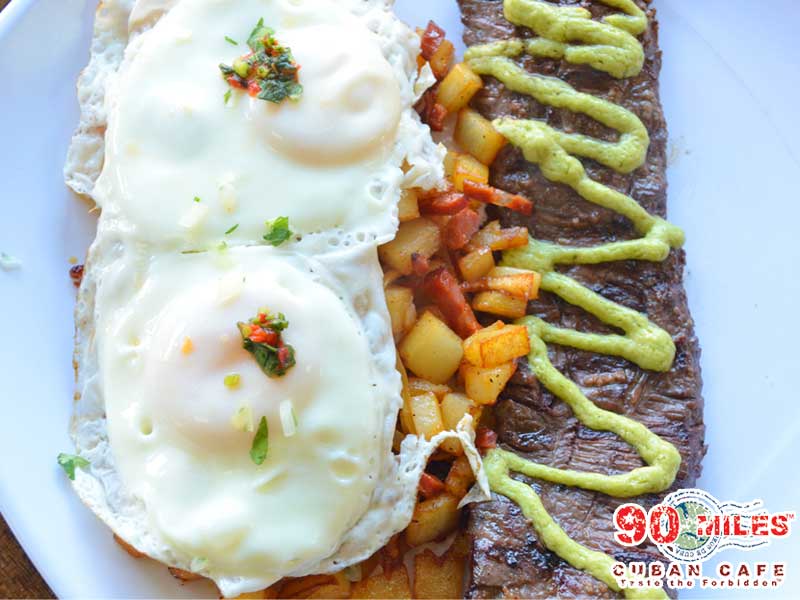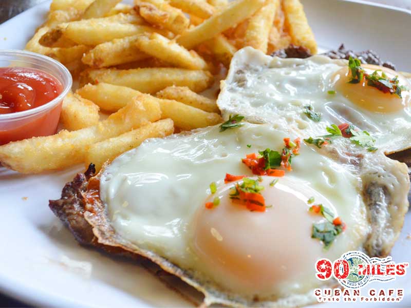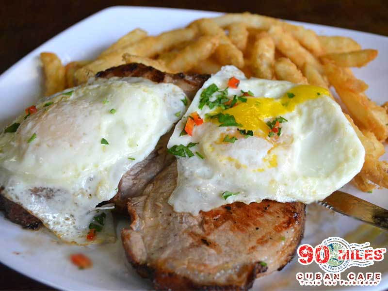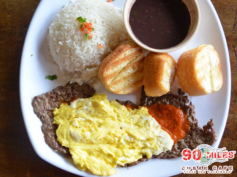 arroz blanco. frigoles negro. two fried or scrambled eggs. french bread. choice of: (bistec de palomilla. lechon. ropa vieja or vaca frita.)